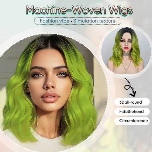 14-Inch Green Wig with Dark Roots, Featuring an Ombre Effect. This Short, Curly, Wavy Wig Has a Middle Part And Is Made from Heat-Resistant Synthetic Hair, Perfect for Daily Wear, Cosplay, Or Parties -
